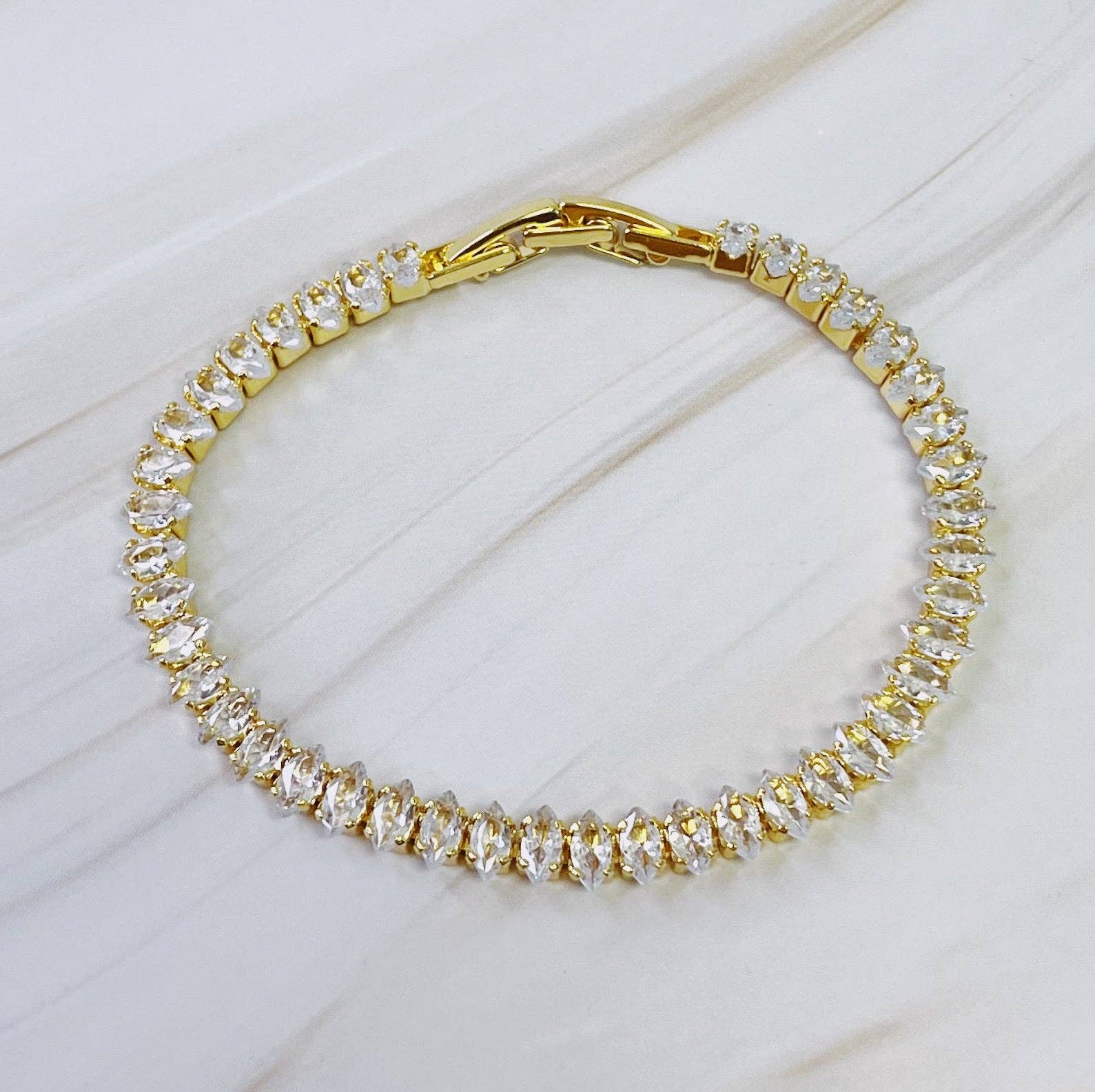 Add a touch of elegance to your wrist with our Marquise Cut Sparkle Tennis Bracelet. The beautiful marquise cut design and an alluring sparkle will add a touch of luxury to any outfit. Elevate your style with this stunning piece. Dimensions: approximately 6.5" with snap closure, has an extra snap closure to adjust size 18k gold plated brass Lead and Nickel free