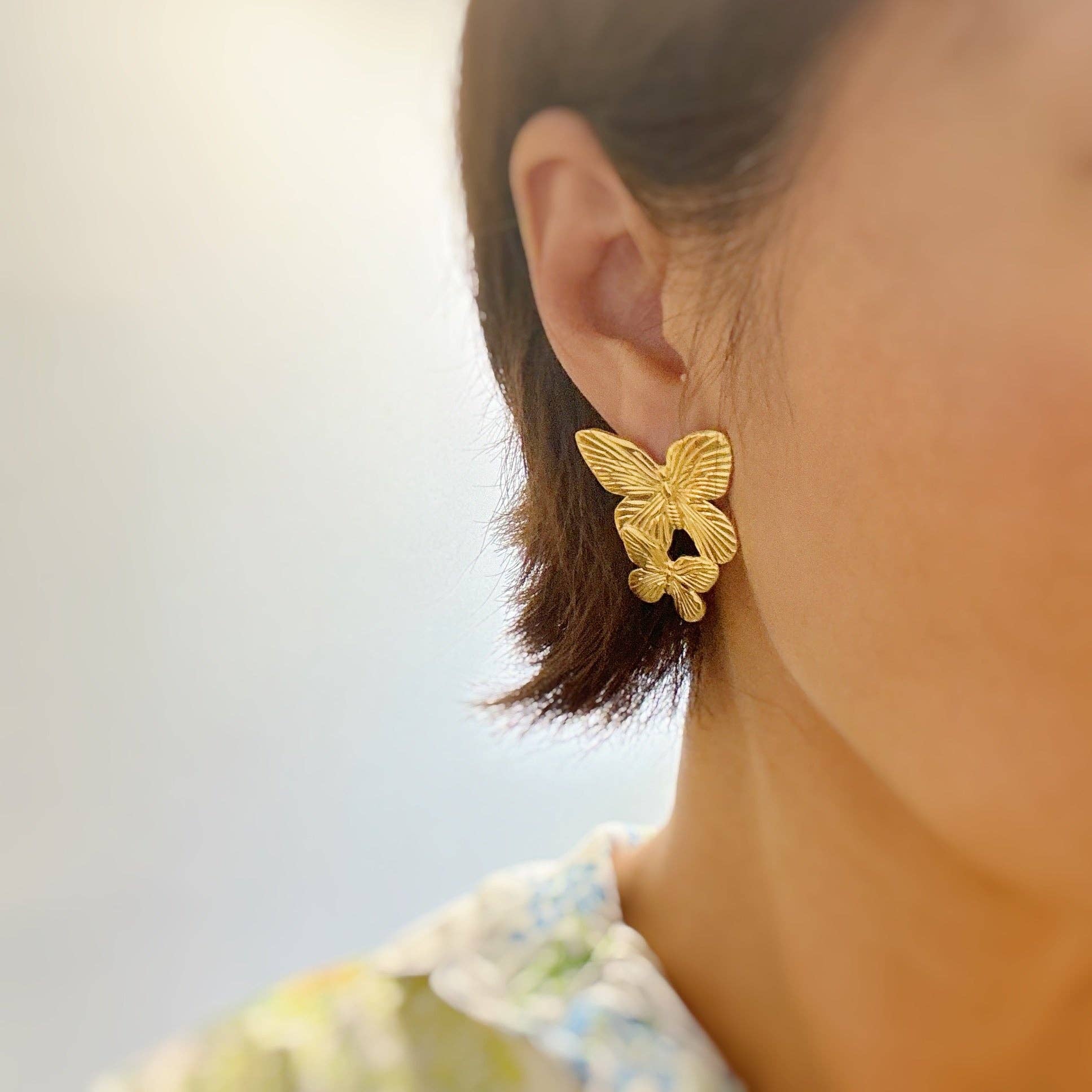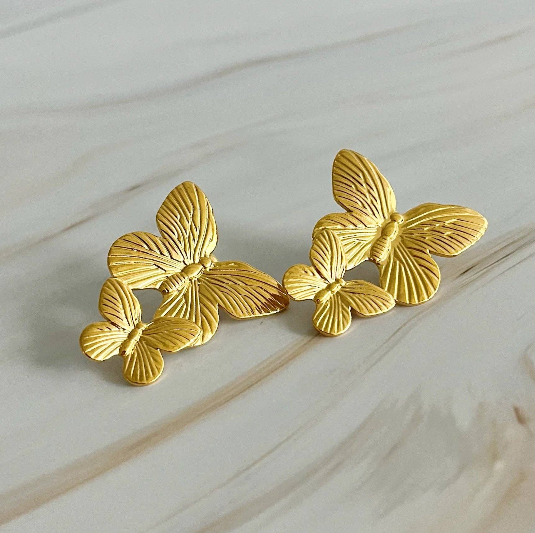 Experience timeless beauty with our Vintage Butterfly Duo Earrings. Crafted with a lovely vintage butterfly design, these earrings are sure to add a touch of elegance to any outfit. With a unique duo structure, these earrings are a must-have for any jewelry collection. Dimensions: approximately 1.5” x 1.2" 18k gold plated stainless steel, tarnish and water resistant Lead and Nickel free